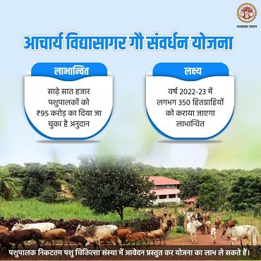 - Subsidy on setting up a Dairy Unit up to the cost of Rs. 10,00,000/- will be provided to beneficiaries under Acharya Vidyasagar Gau Samvardhan Yojana.